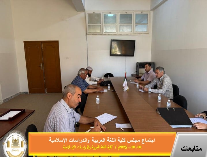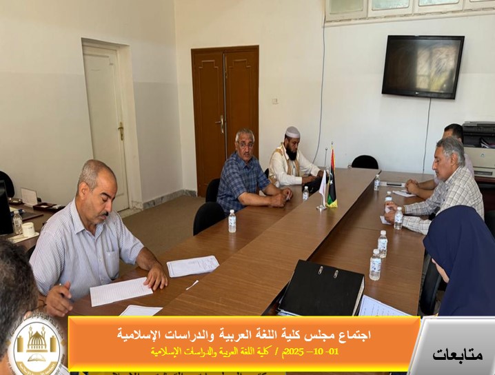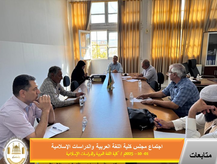 عقد مجلس كلية اللغة العربية والدراسات الإسلامية صباح يوم الأربعاء الموافق 01-10-2025م، اجتماعه الدوري برئاسة السيد عميد الكلية د.سالم خليفة حسين، وبحضور السيدة وكيل الكلية للشؤون العلمية د. وفاء محمد العاتي، والسادة أعضاء المجلس.