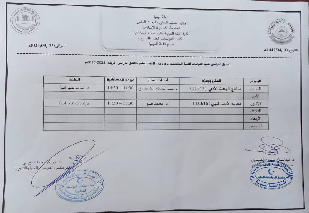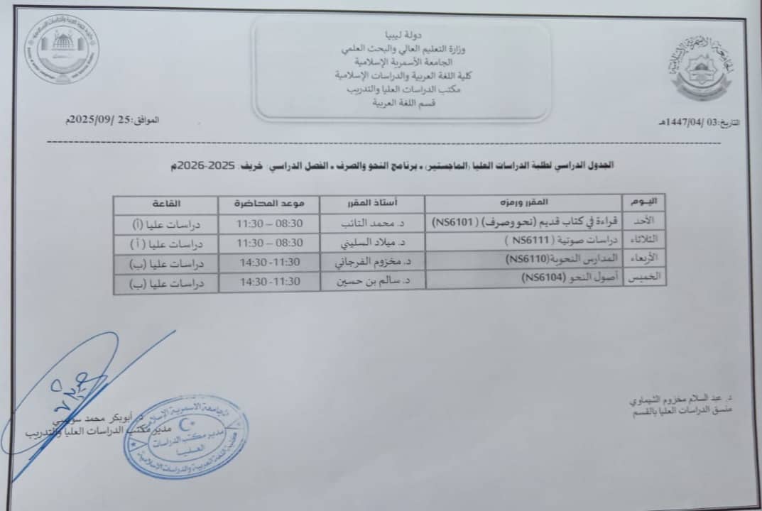 الجداول الدراسية لمرحلة الإجازة العالية العالية (الماجستير) للفصل الدراسي خريف 2025م لكافة البرامج