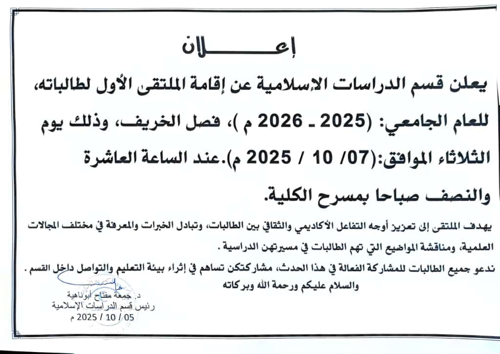يعلن قسم الدراسات الإسلامية عن إقامة الملتقى الأول لطالباته، للفصل الدراسي خريف 2025م، وذلك يوم الثلاثاء الموافق 07-10-2025م، عند الساعة 10:30صباحا، بمسرح الكلية.