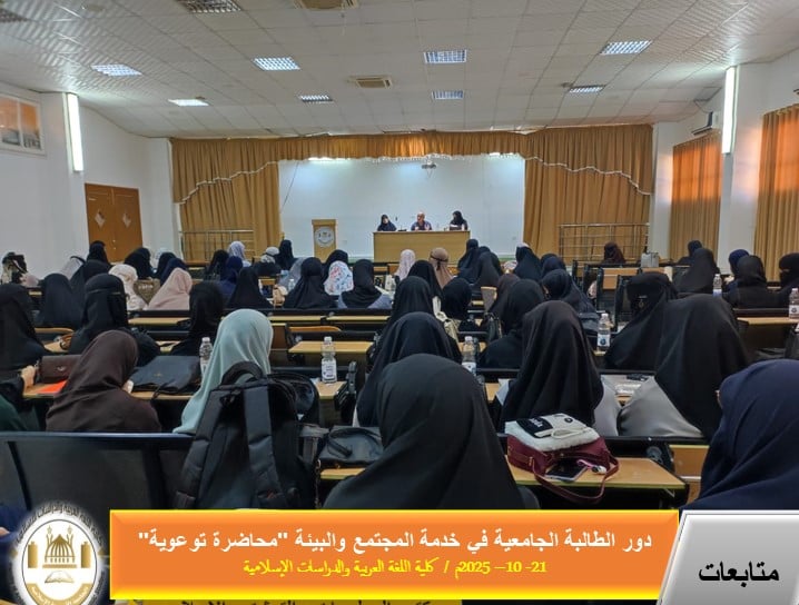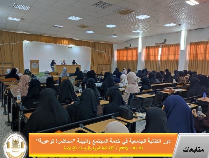 نظّم قسم الدراسات الإسلامية بالجامعة الأسمرية الإسلامية، صباح يوم الثلاثاء الموافق 21 أكتوبر 2025، محاضرة توعوية قيّمة بعنوان “دور الطالبة الجامعية في خدمة المجتمع والبيئة“.