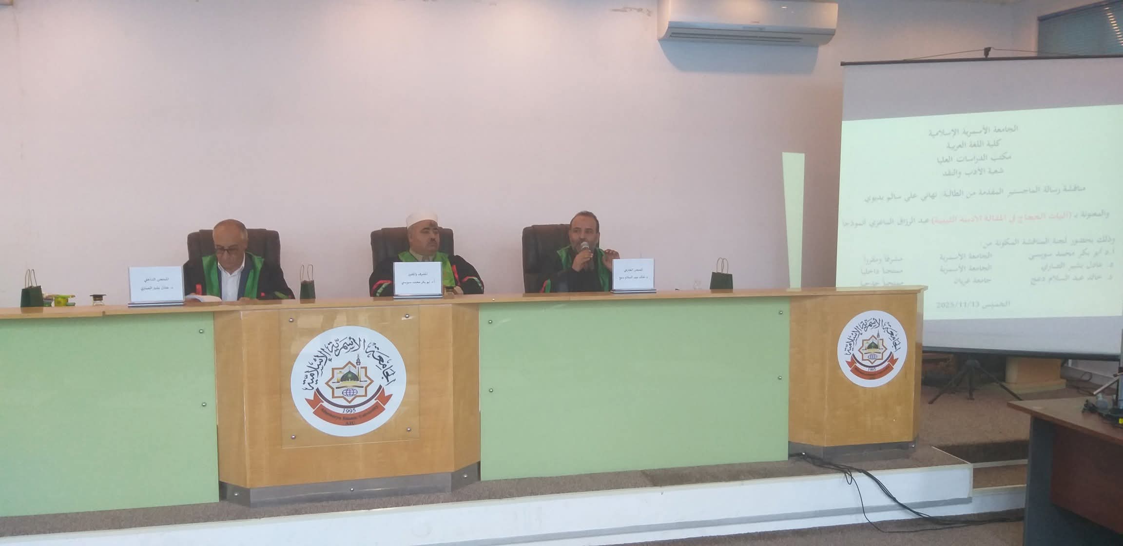 شهد مدرج الشيخ عبدالسلام الأسمر بمبنى الإدارة العامة للجامعة الأسمرية، صباح يوم الخميس 13 نوفمبر 2025، مناقشة رسالة الإجازة العالية(الماجستير) للطالبة تهاني علي بديوي، المقيدة بقسم اللغة العربية برنامج الأدب والنقد، بعنوان: