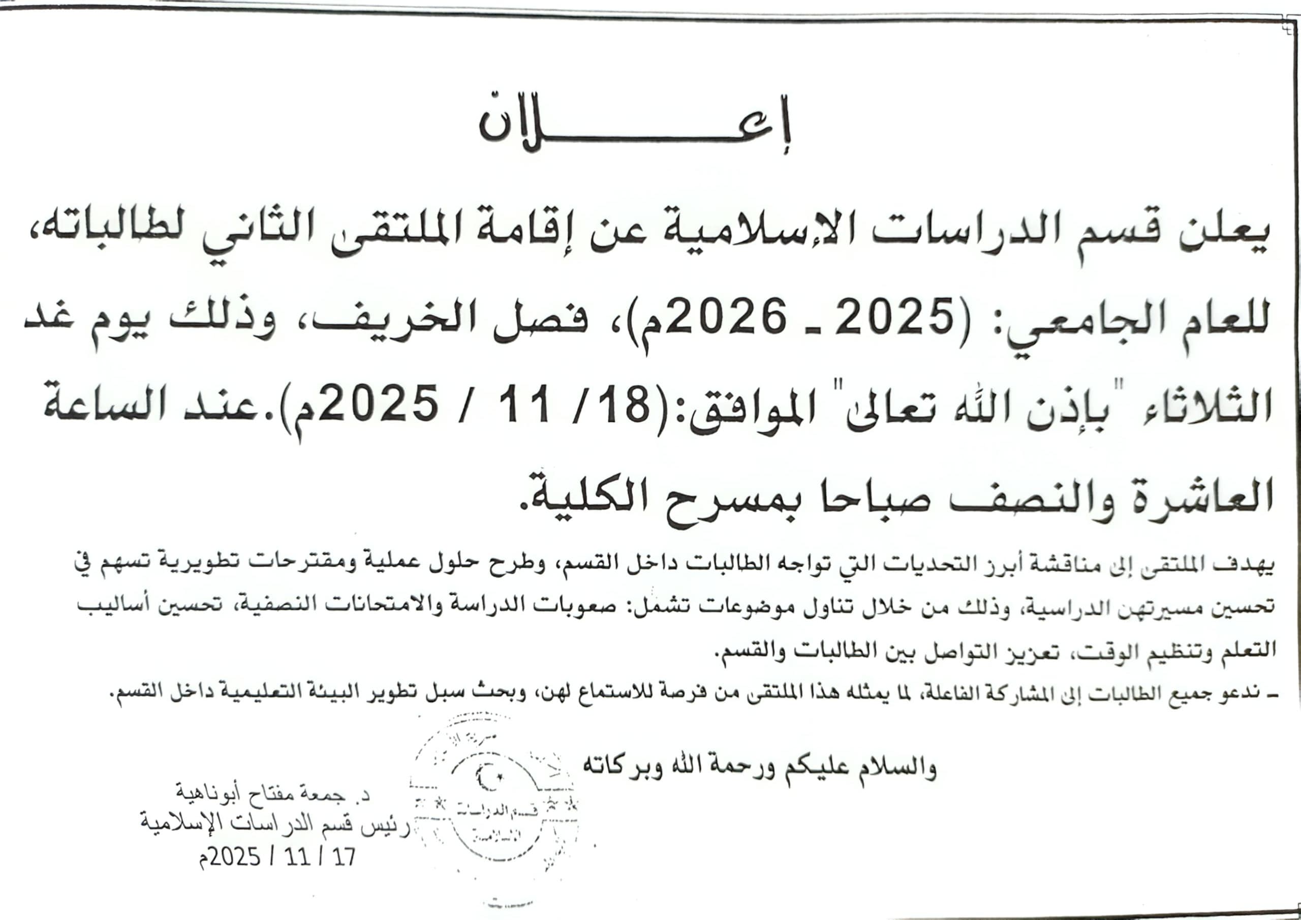 يعلن قسم الدراسات الإسلامية عن إقامة الملتقى الثاني لطالباته للعام الجامعي: 2025 – 2026م، فصل الخريف، وذلك يوم غد الثلاثاء بإذن الله تعالى الموافق : (18/ 11 / 2025م). عند الساعة العاشرة والنصف صباحا بمسرح الكلية.