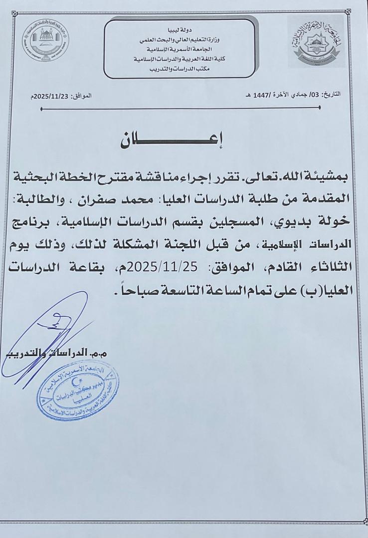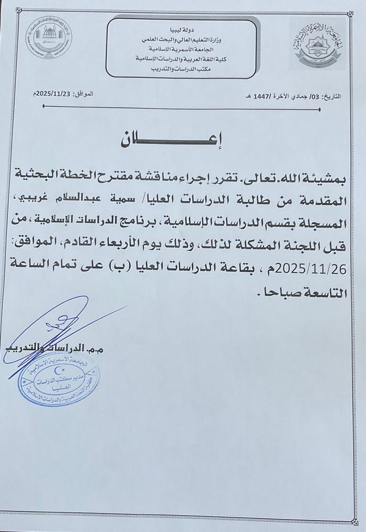 فيما تقرر مناقشة مقترح الخطة البحثية المقدمة من طالبة الدراسات العليا سمية عبدالسلام غريبي، المسجلة بقسم الدراسات الإسلامية، برنامج الدراسات الإسلامية ، من قبل اللجنة المشكلة لذلك، وذلك يوم الأربعاء القادم الموافق: 2025/11/26م ، بقاعة الدراسات العليا (ب) على تمام الساعة التاسعة صباحا.