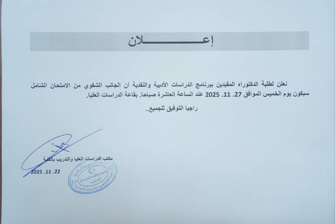 يعلن مكتب الدراسات العليا والتدريب بالكلية لطلبة الإجازة الدقيقة (الدكتوراه) المقيدين ببرنامج الدراسات الأدبية والنقدية، أن الجانب الشفوي من الامتحان الشامل سيكون يوم الخميس الموافق 27 11 2025 عند الساعة العاشرة صباحا بقاعة الدراسات العليا.