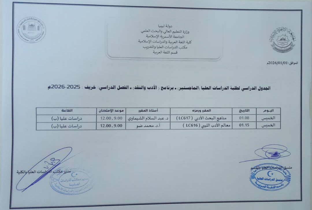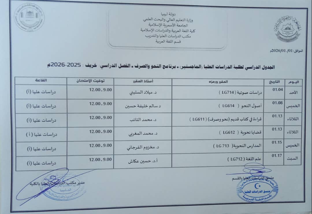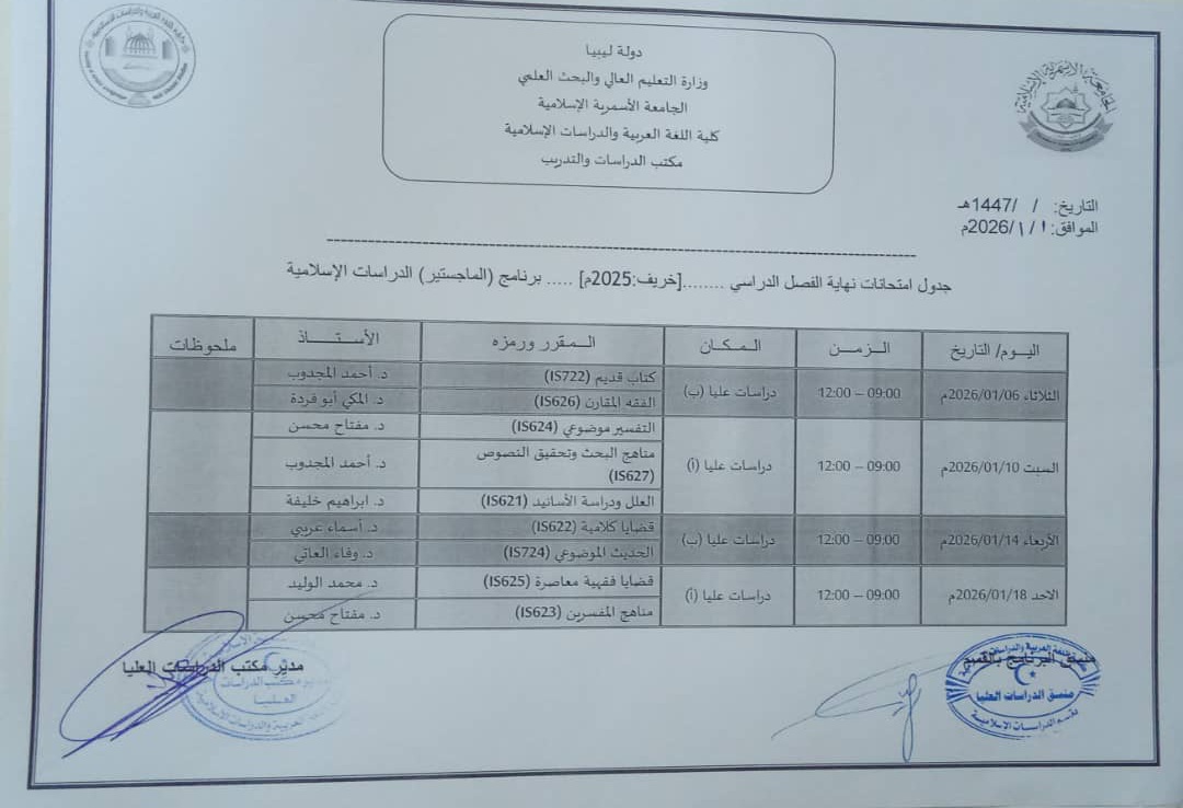 جدول الامتحانات النهائية لبرامج الدراسات العليا للفصل الدراسي خريف 2025م