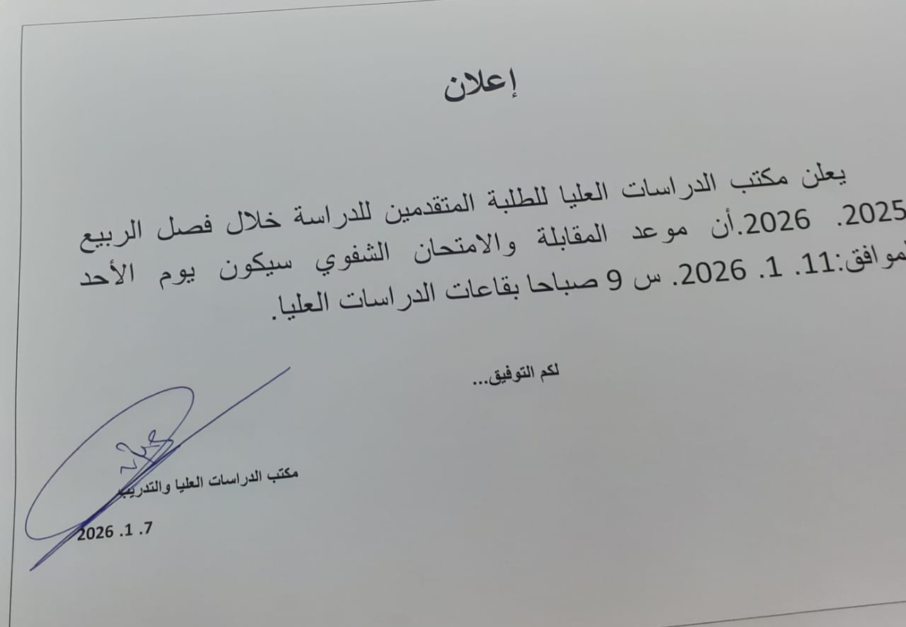 يعلن مكتب الدراسات العليا بالكلية للطلبة المتقدمين للدراسة خلال فصل الربيع 2025–2026 أن موعد المقابلة والامتحان الشفوي سيكون يوم الأحد الموافق: 11 / 1 / 2026، على الساعة 9 صباحًا بقاعات الدراسات العليا.