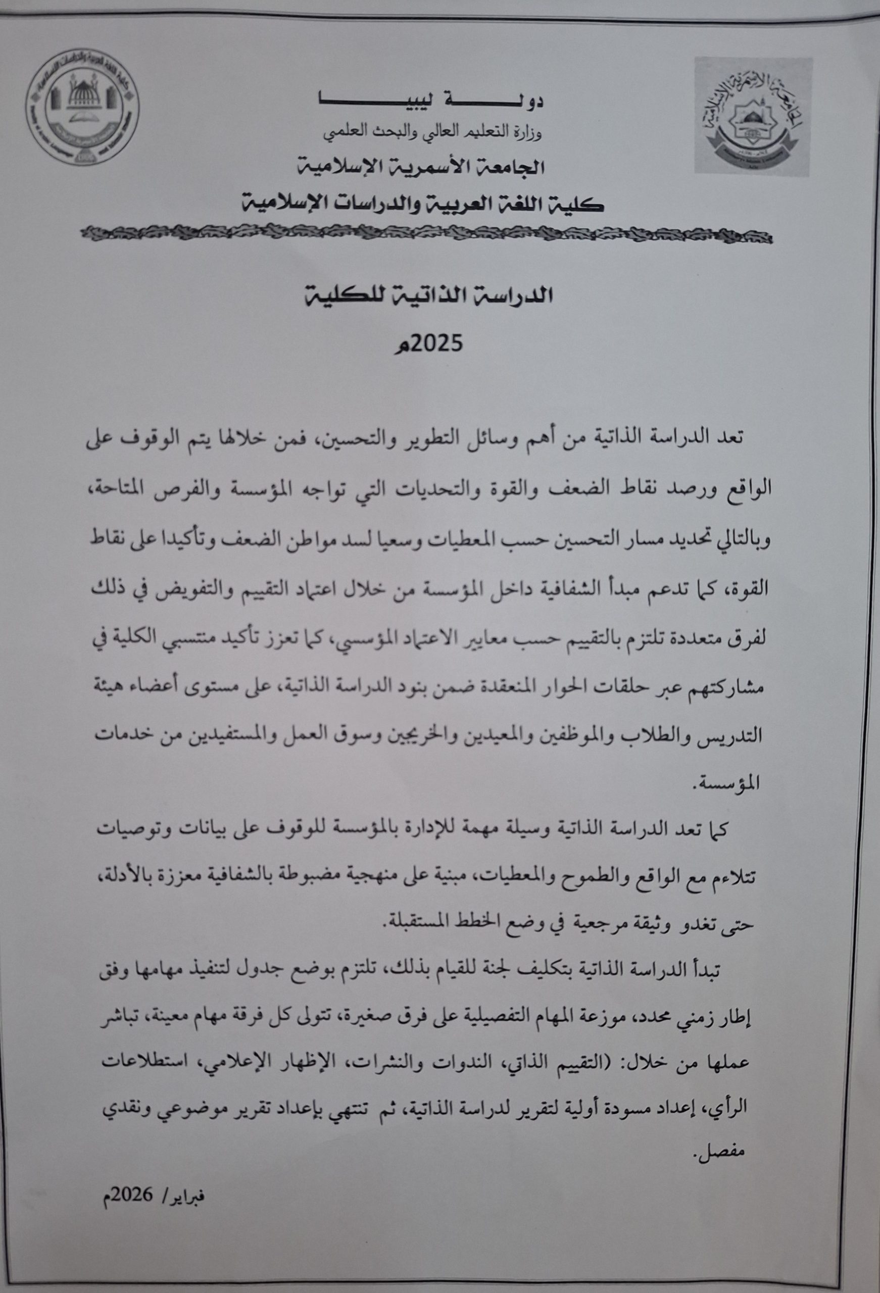 في إطار سعيها المتواصل نحو الارتقاء بالأداء الأكاديمي وتعزيز معايير الجودة، انطلقت صباح يوم الأحد 08-02-2026م، الزيارات الميدانية للجنة الدراسة الذاتية.