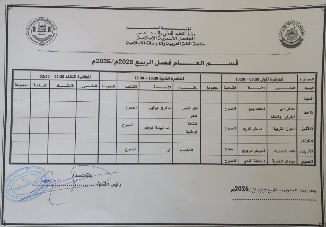 جدول المحاضرات الدراسية للقسم العام