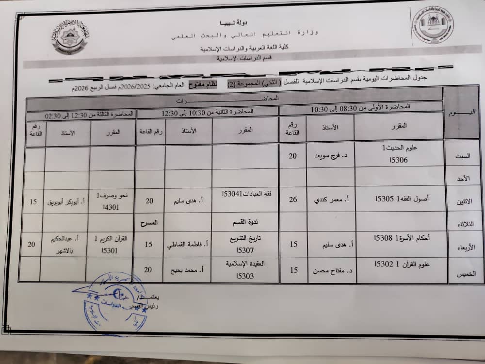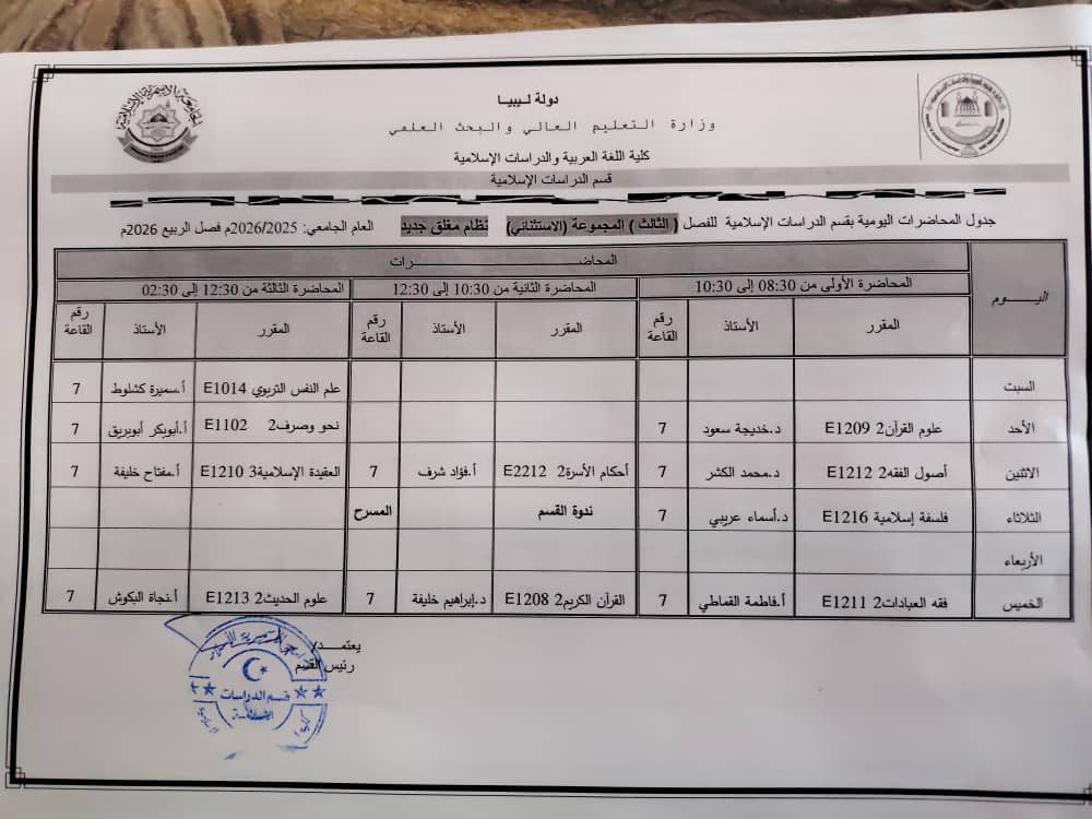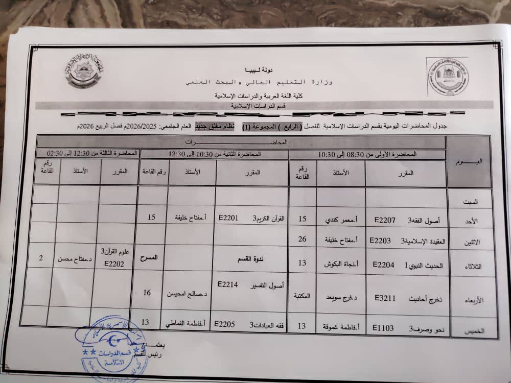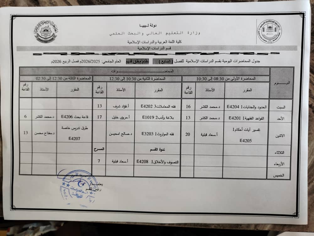 جدول المحاضرات الدراسية لقسم الدراسات الإسلامية