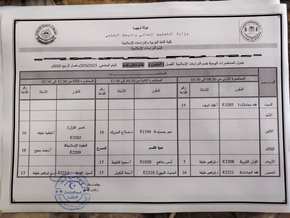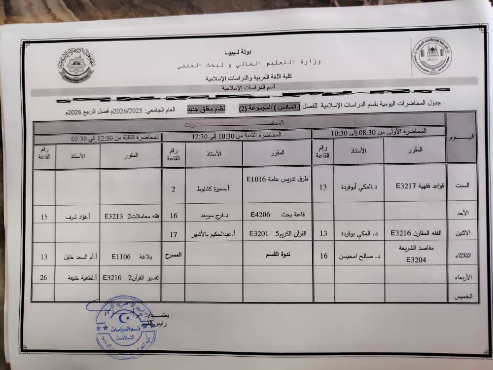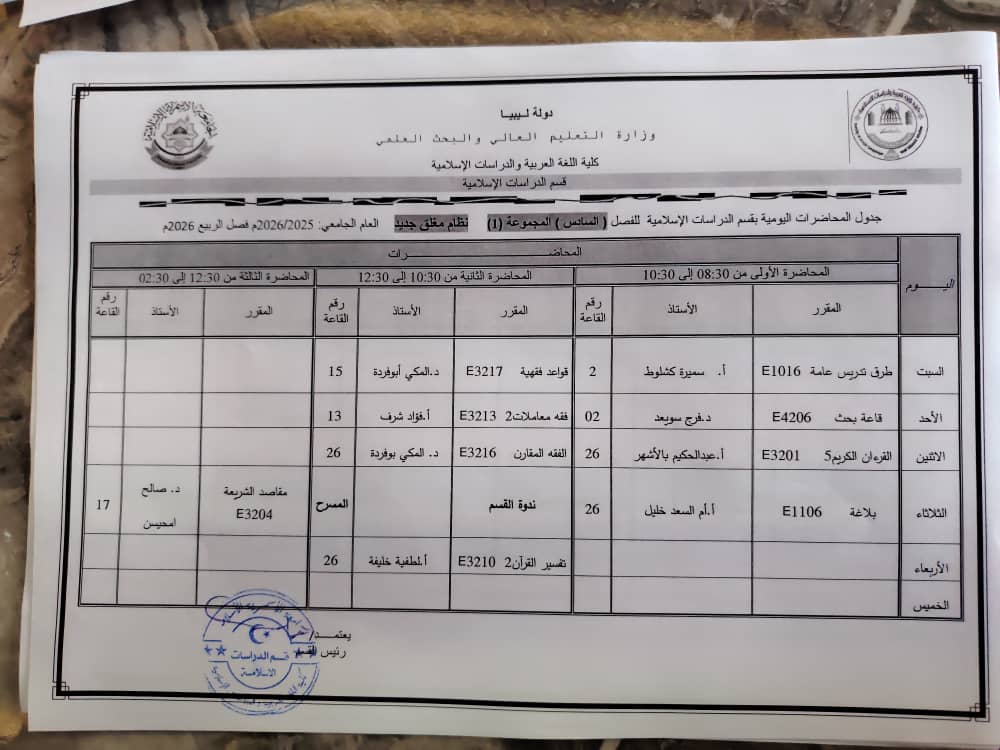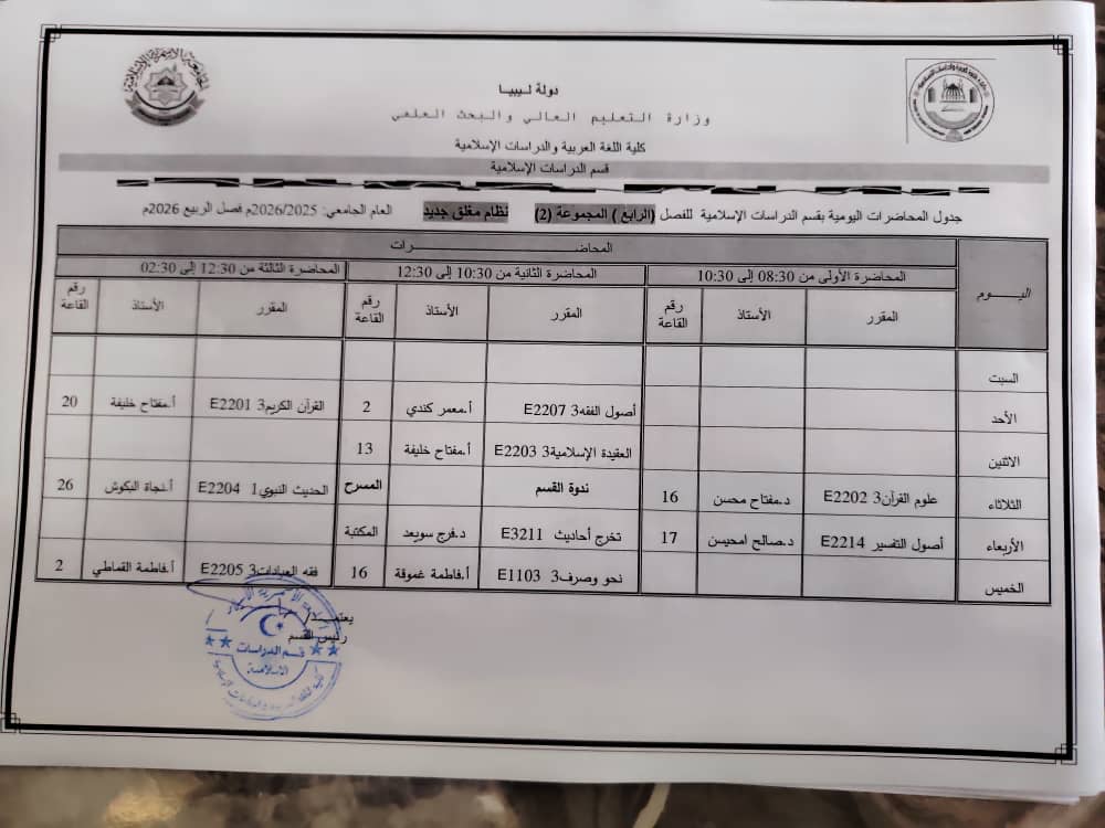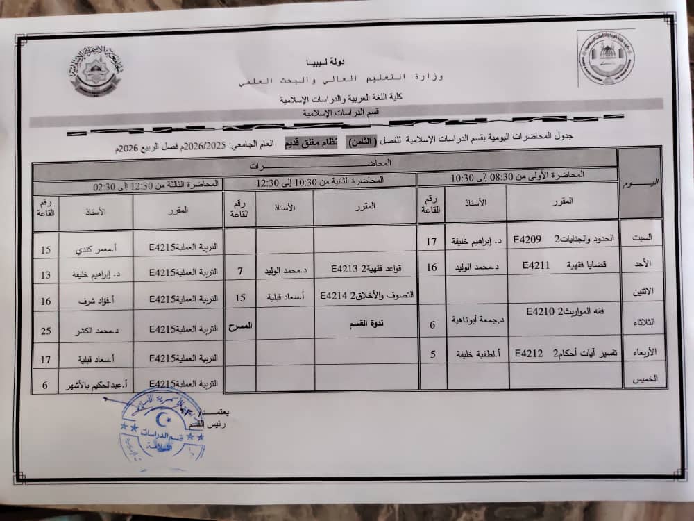 جدول المحاضرات الدراسية لقسم الدراسات الإسلامية