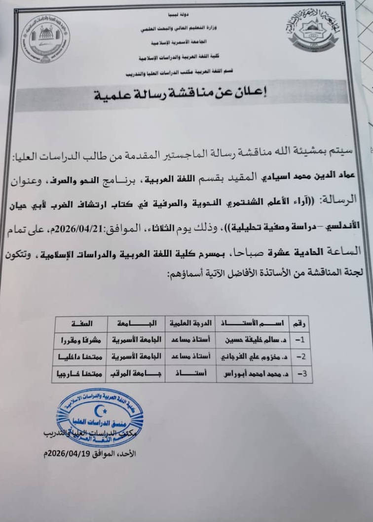وذلك يوم الثلاثاء الموافق: 2026/04/21م، على تمام الساعة الحادية عشرة صباحًا، بمدرج كلية اللغة العربية والدراسات الإسلامية.