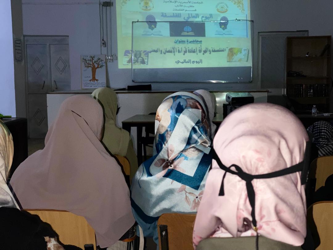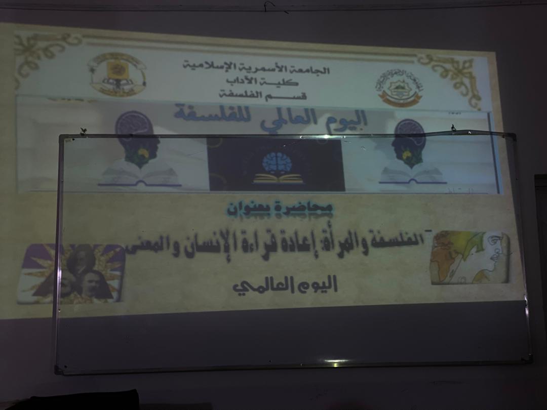 3. هوية المرأة بين الخطاب الاجتماعي والفكر الفلسفي ألقته الدكتورة : فاطمة علي الهدار . بحضور عميد الكلية د. أنور عبد السلام عصمان ومدير مكتب مجلس الكلية ،و مدير مكتب الدراسات العليا والتدريب بالكلية .و رئيس قسم التربية وعلم النفس . وعدد من أعضاء هيئة التدريس من قسم الفلسفة والأقسام الأخرى، بالإضافة إلى أمين المكتبة ورئيس قسم الوسائل التعليمية وبعض الموظفين والموظفات وطالبات ( الفصل التمهيدي) وطالبات القسم والأقسام الأخرى.