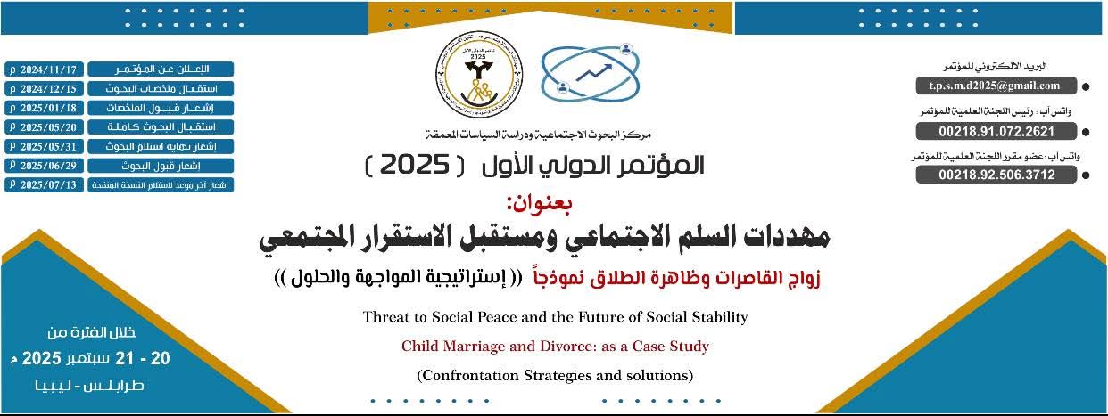 انعقد المؤتمر بمدينة مصراتة خلال الفترة 29–30 نوفمبر 2025، مستهدفاً تعزيز الاستقرار المجتمعي وحماية الفئات الهشة. وشكّل محطة مهمة لتبادل الخبرات والأفكار بين الباحثين والخبراء وصنّاع القرار، حيث ناقش أبرز التحديات التي تواجه الأسرة الليبية، وفي مقدمتها زواج القاصرات وتزايد معدلات الطلاق، مع التركيز على وضع استراتيجيات عملية للحد من هذه الظواهر وآثارها على السلم الاجتماعي