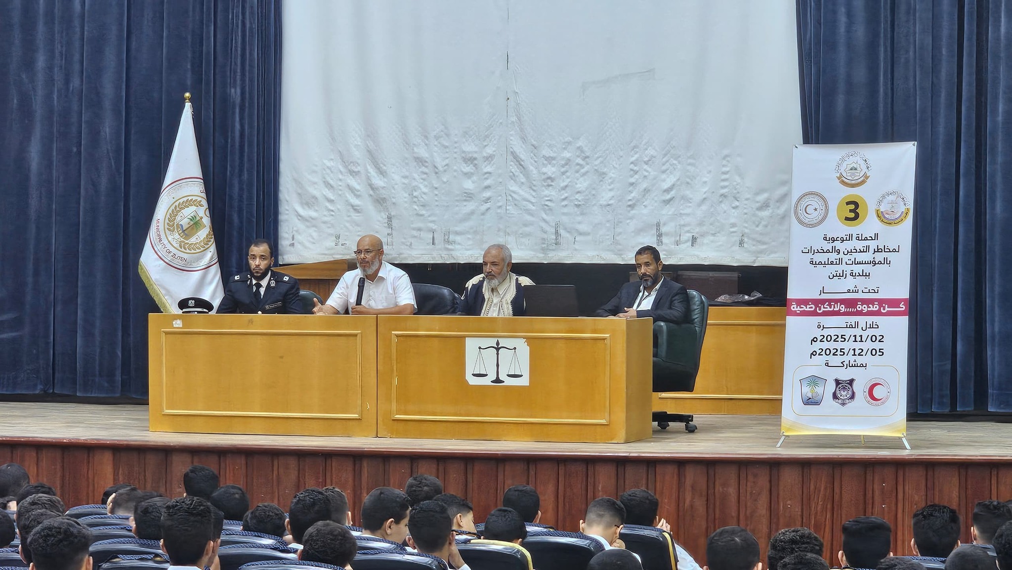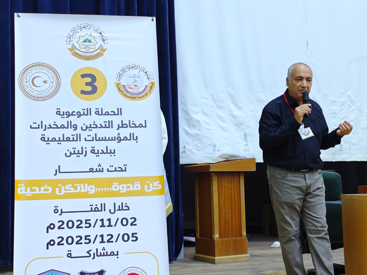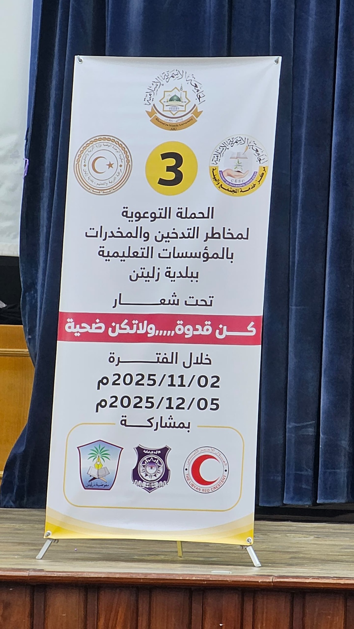 ضمن برنامج الحملة التوعوية التي تنفذها الجامعة الأسمرية الإسلامية للعام الثالث على التوالي، وفي إطار مسؤوليتها المجتمعية لمكافحة الظواهر السلبية، قام فريق الحملة اليوم بالقاء محاضرة بالمسرح الوطني لطلاب ثانوية زليتن المركزية.