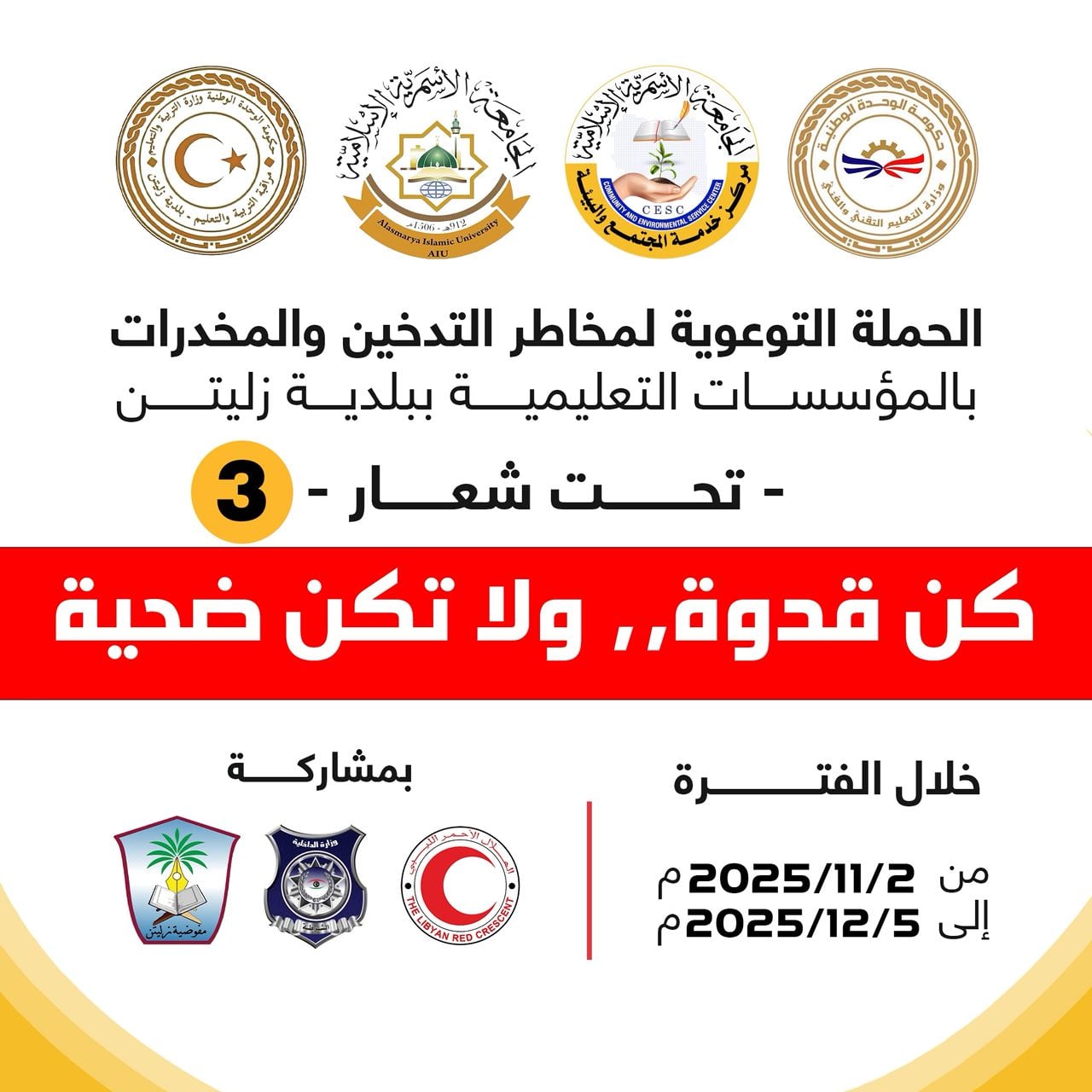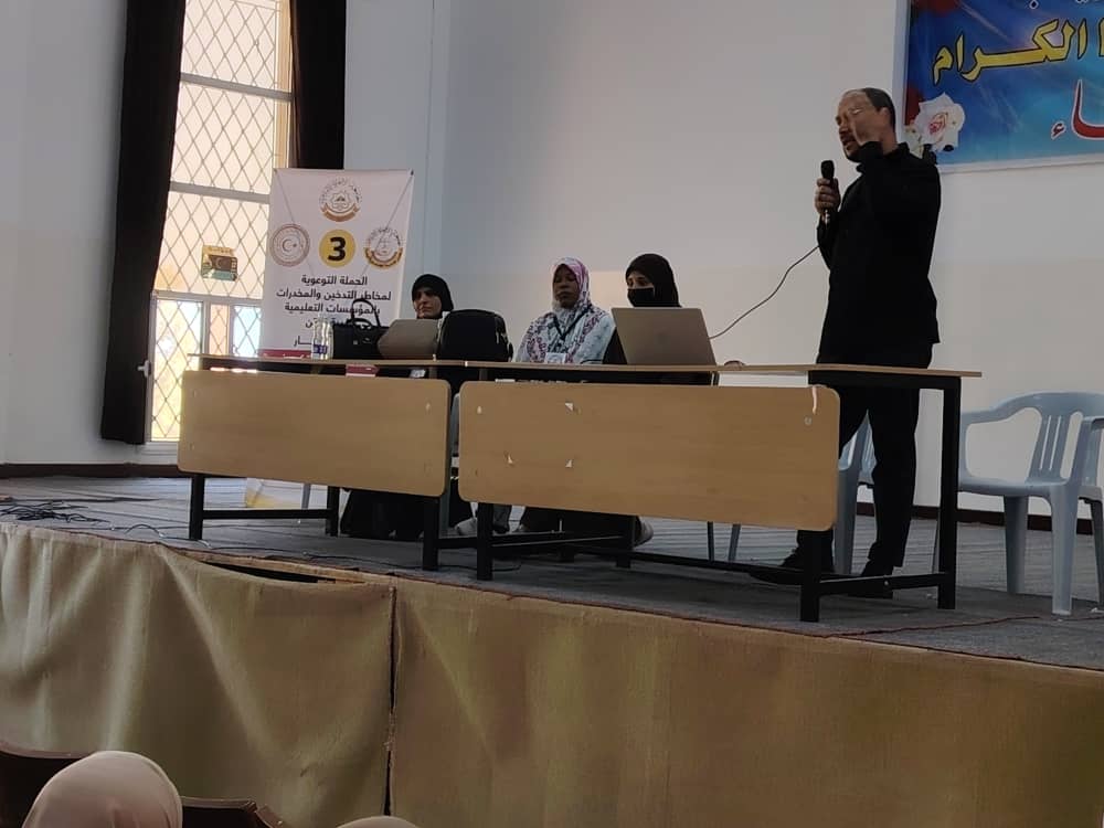 تواصل الجامعة الأسمرية الإسلامية في تنفيذ حملتها التوعوية حول مخاطر التدخين وتعاطي المخدرات للأسبوع الثالث على التوالي للعام الثالث ، وذلك برعاية مركز خدمة المجتمع والبيئة بالجامعة، وبمشاركة كل من مديرية أمن زليتن، وجمعية الهلال الأحمر الليبي، ومفوضية كشاف زليتن.