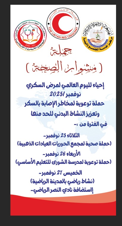 يشارك مركز خدمة المجتمع والبيئة بالجامعة برفقة فريق من أطباء كلية الطب البشري في حملة “مشوار الصحة” التي تنفذها جمعية الهلال الأحمر الليبي – فرع زليتن اليوم داخل مجمع العيادات الذهبية الحوريات، وذلك احتفاءً باليوم العالمي للسكري.