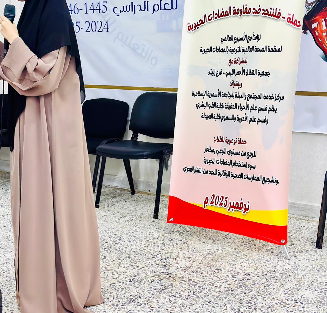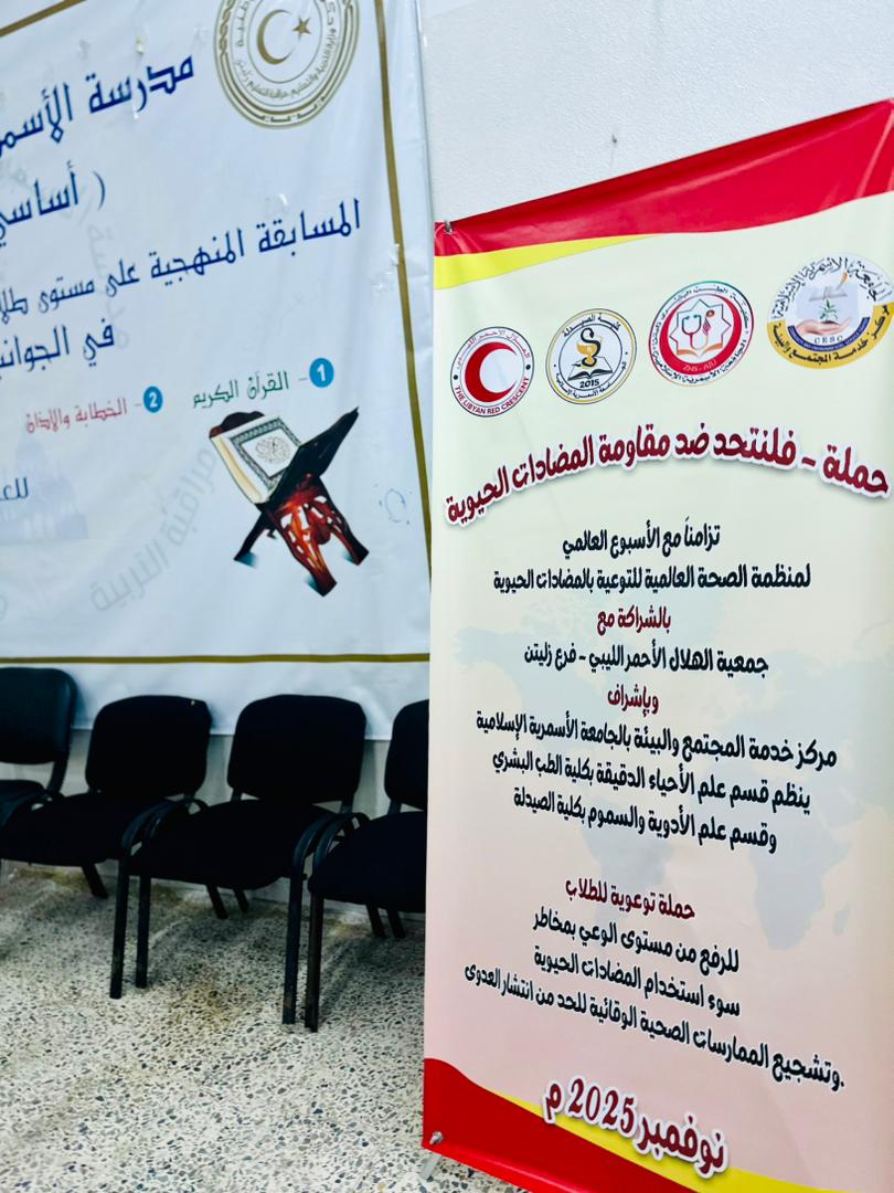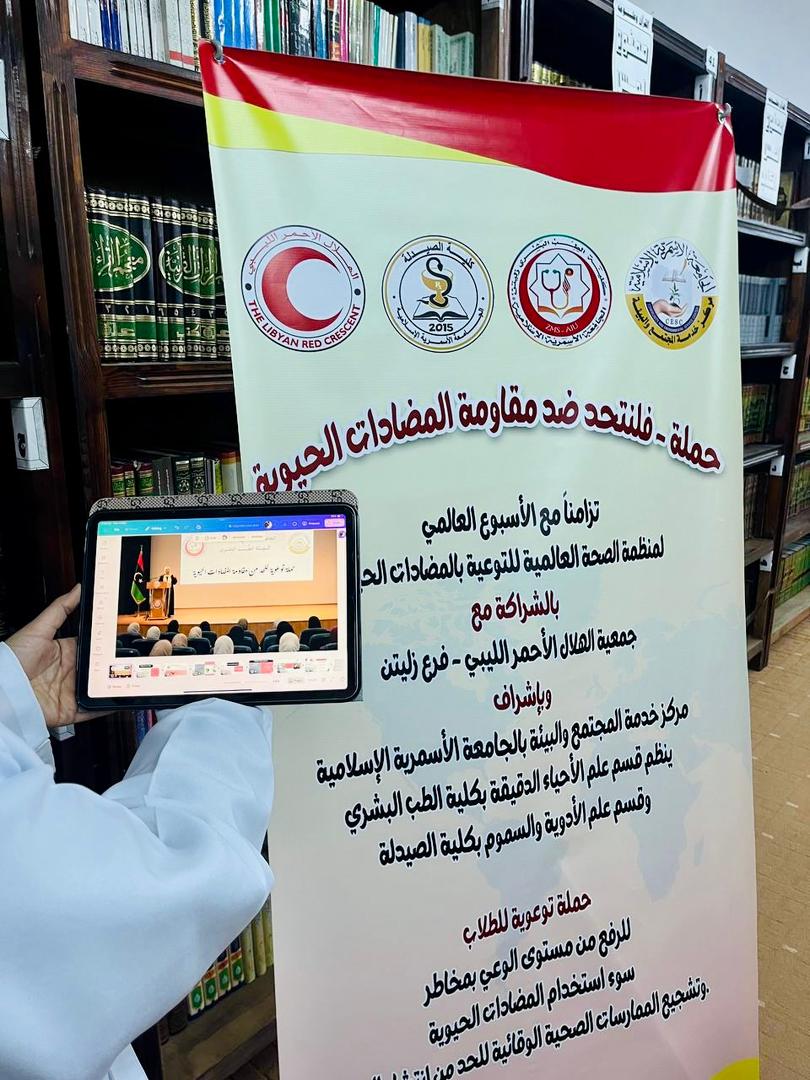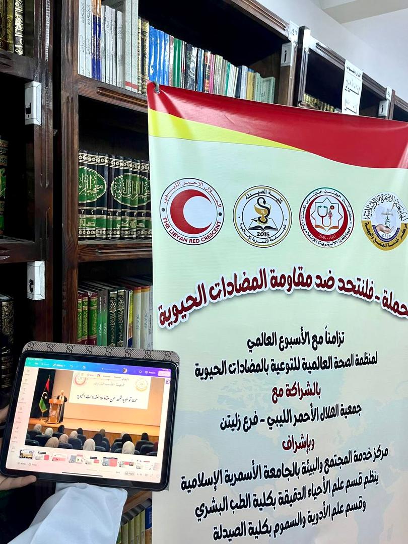 يواصل فريق التوعية بمخاطر سوء استخدام المضادات الحيوية وبإشراف مركز خدمة المجتمع والبيئة بالجامعة الأسمرية الإسلامية، وبالشراكة مع جمعية الهلال الأحمر الليبي – فرع زليتن،