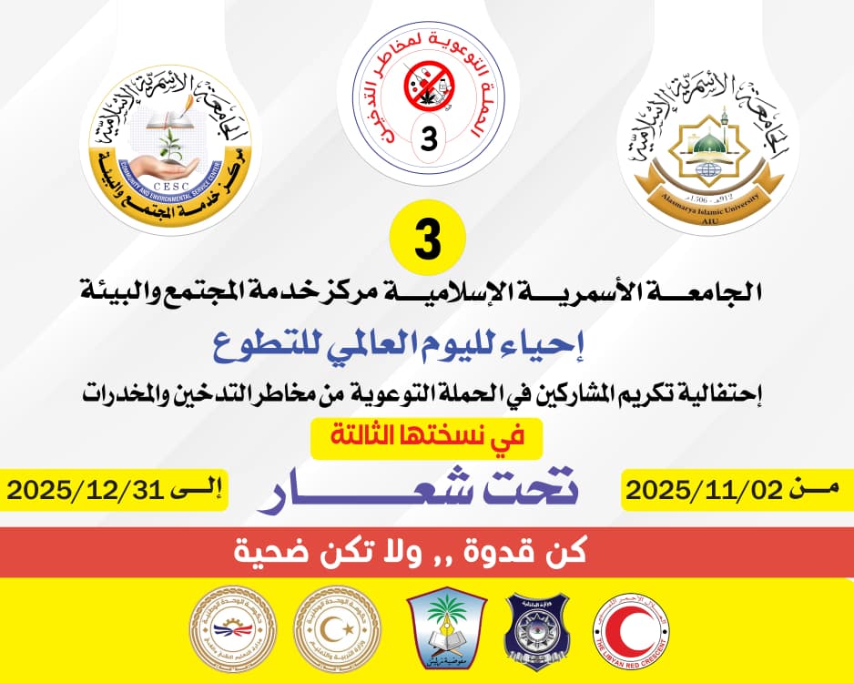 أُقيمت صباح اليوم بقاعة الاجتماعات الرئيسة بالجامعة الأسمرية الإسلامية احتفالية إحياء اليوم العالمي للتطوع، بإشراف مركز خدمة المجتمع والبيئة، وبحضور عدد من القيادات الأكاديمية وممثلي المؤسسات التعليمية والأمنية والتطوعية.