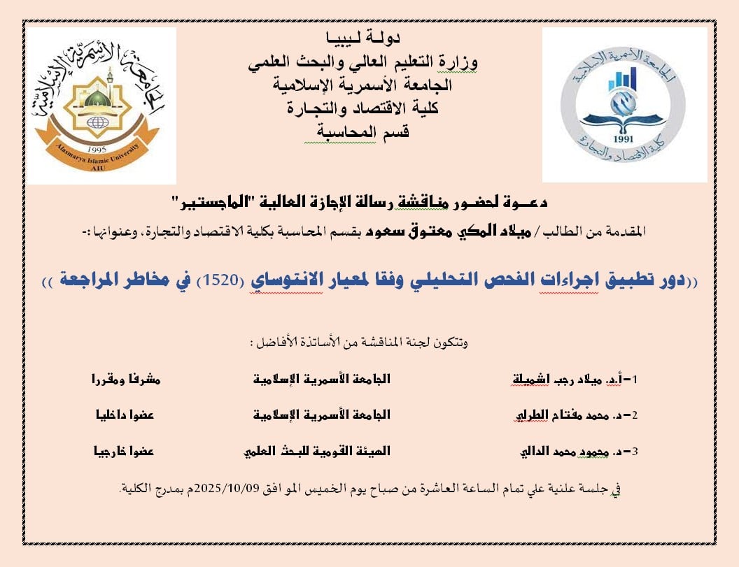 يتشرف قسم المحاسبة بكلية الاقتصاد والتجارة بدعوتكم لحضور مناقشة رسالة الإجازة العالية (الماجستير)، والموسومة بعنوان: