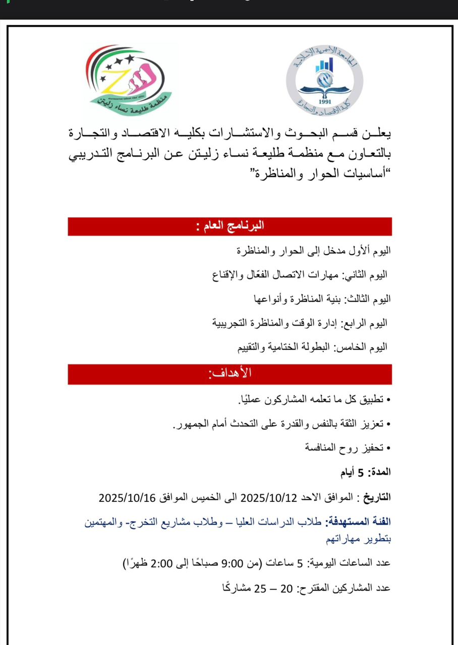 يعلن قسم البحوث والاستشارات بكلية الاقتصاد والتجارة – الجامعة الأسمرية الإسلامية بالتعاون مع منظمة طليعة نساء زليتن، عن انطلاق البرنامج التدريبي ” أساسيات الحوار والمناظرة” .
