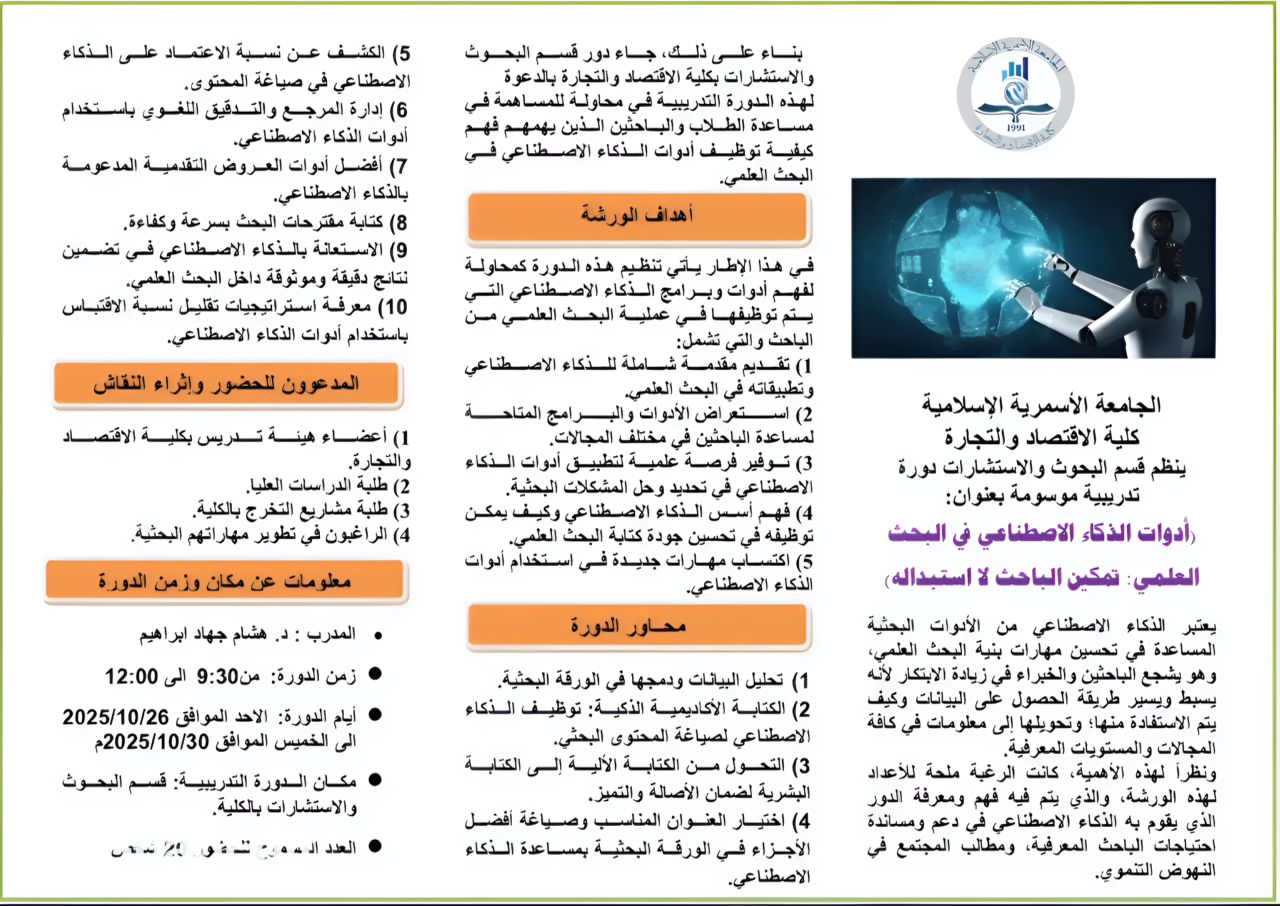 في إطار سعي قسم البحوث والاستشارات بكلية الاقتصاد والتجارة – الجامعة الأسمرية الإسلامية، إلى تعزيز قدرات الباحثين في مجال استخدام أدوات الذكاء الاصطناعي في البحث العلمي، يسر القسم أن يعلن عن تنظيم دورة تدريبية متخصصة بعنوان: