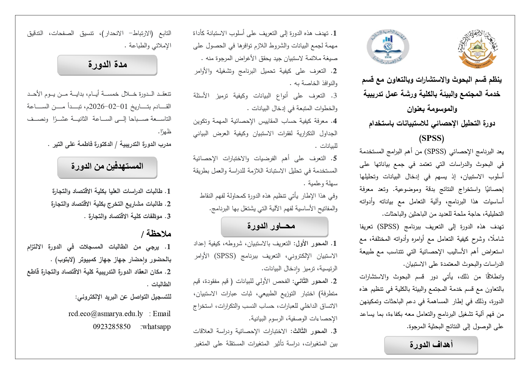 - أساسيات الاستبيان وبرنامج SPSS: إعداد الاستبيان، التعريف بالبرنامج، إدخال البيانات وترميزها.