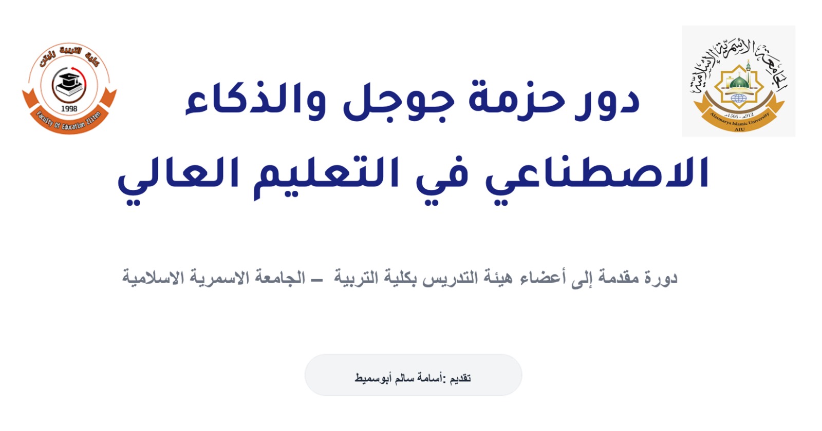 اختتمت ظهر يوم الثلاثاء الموافق 2025/11/25 بمعمل الحاسوب الدورة التدريبية لأعضاء هيئة التدريس بالكلية بعنوان “دور حزمة جوجل والذكاء الاصطناعي في التعليم العالي” والتي قدمها الأستاذ أسامة سالم أبوسميط وشارك فيها عدد من أساتذة الكلية واستمرت أربعة أيام بواقع ثلاث ساعات يوميا.