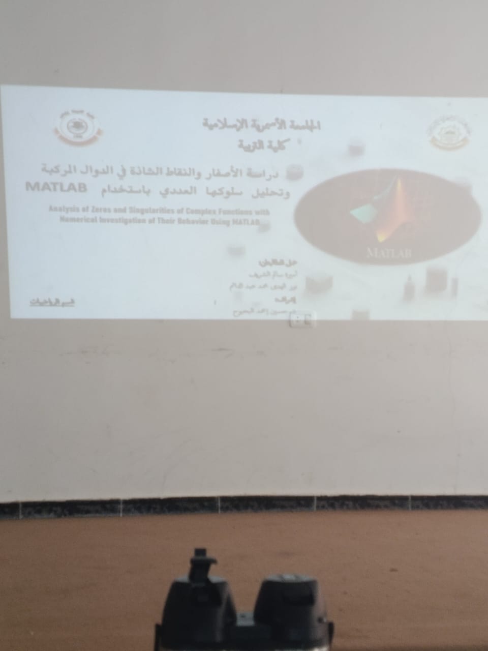 في ختام الملتقى والذي تخللته حلقة نقاش علمية حول مشروع تخرج بعنوان (دراسة الأصفار والنقاط الشاذة في الدوال المركبة وتحليل سلوكها العددي باستخدام MATLAB)، أثراها د. حسين البحبوح وطالبات المشروع، تم توزيع مطوية التعريف بالقسم واستبانة حول الملتقى على الحاضرين من طالبات وأعضاء هيئة تدريس .