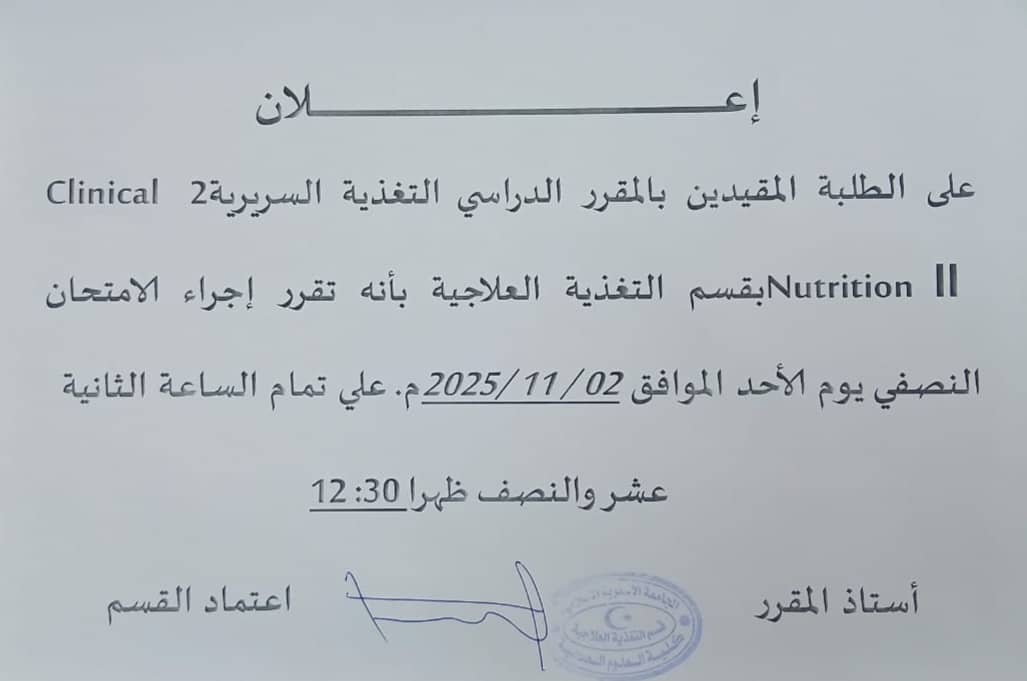 على جميع طلبة قسم التغذية العلاجية،الدارسين بمقرر التغذية السريرية2 (Clinical Nutrition II)، أخذ العلم بأن الامتحان النصفي سوف يكون يوم الأحد الموافق: 02 / 11 / 2025م، على تمام الساعة الثانية عشر والنصف ( 30 : 12 ) ظهرًا.
