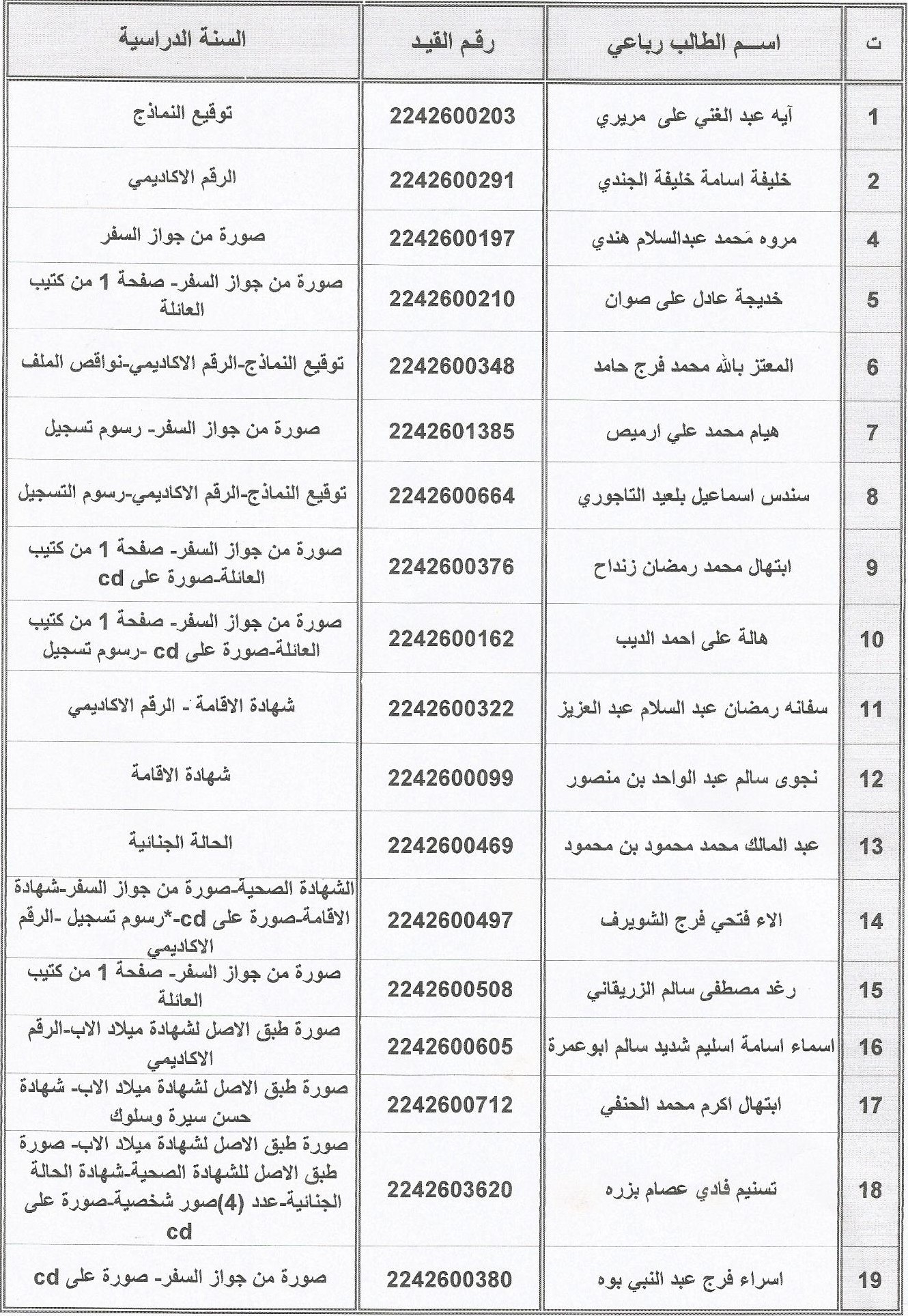 على جميع الطلبة الأتية أسمائهم أستكمال الإجراءات المطلوبة على حسب الكشف المرفق ومراجعة مكتب مسجل الكلية وذلك قبل نهاية دوام يوم الخميس الموافق: 27 / 11 / 2025م.