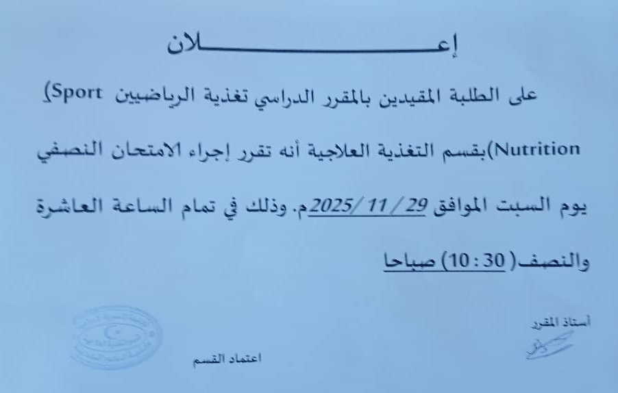 على جميع طلبة قسم التغذية العلاجية، الدارسين بمقرر تغذية الرياضيين، أخذ العلم بأن الامتحان النصفي سوف يكون يوم السبت الموافق: 29/ نوفمبر / 2025م، على تمام الساعة العاشرة والنصف ( 30 : 10 ) صباحًا.