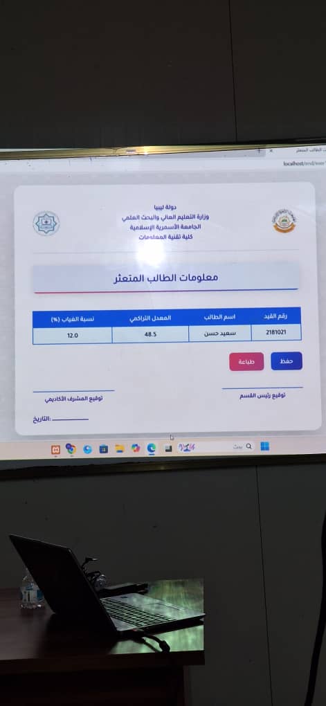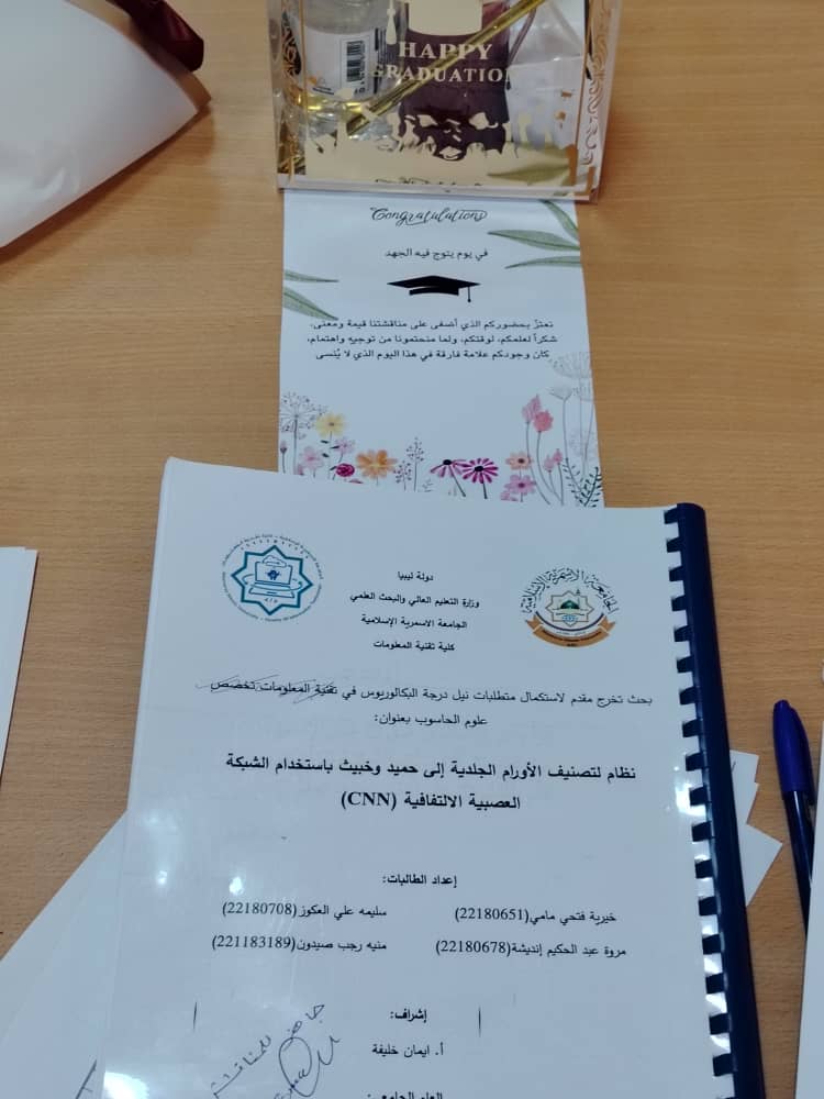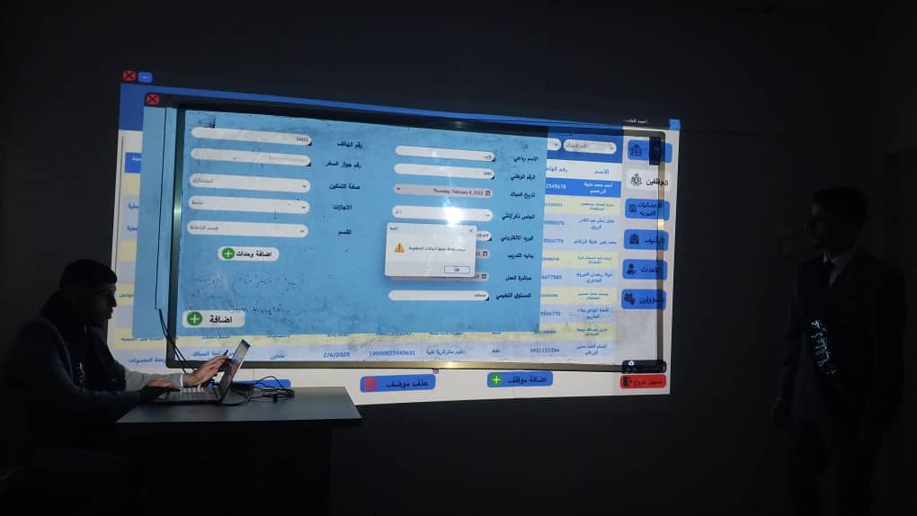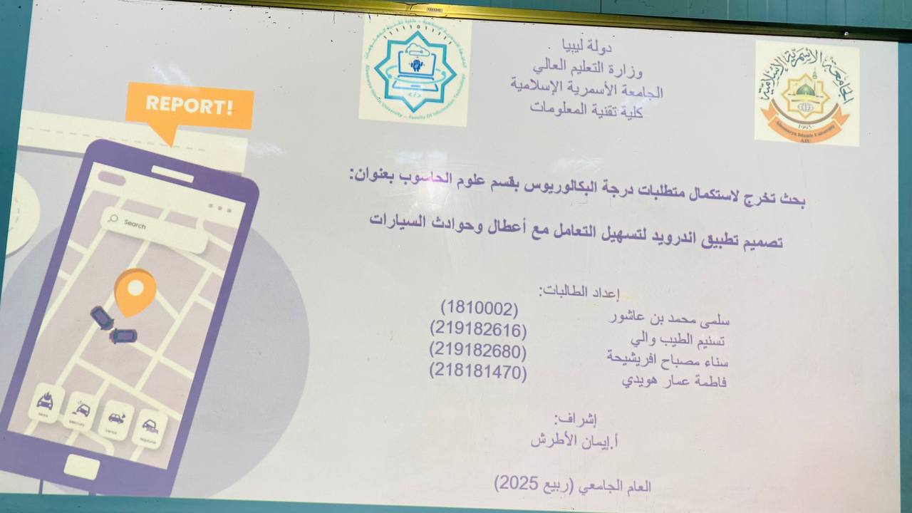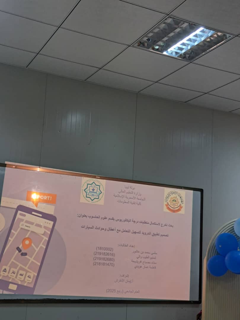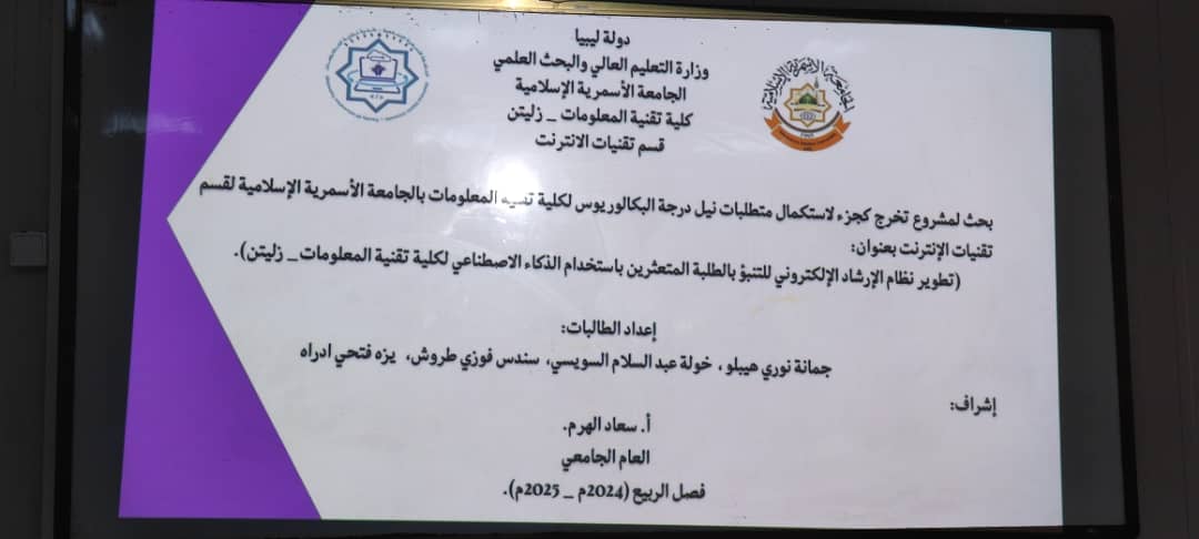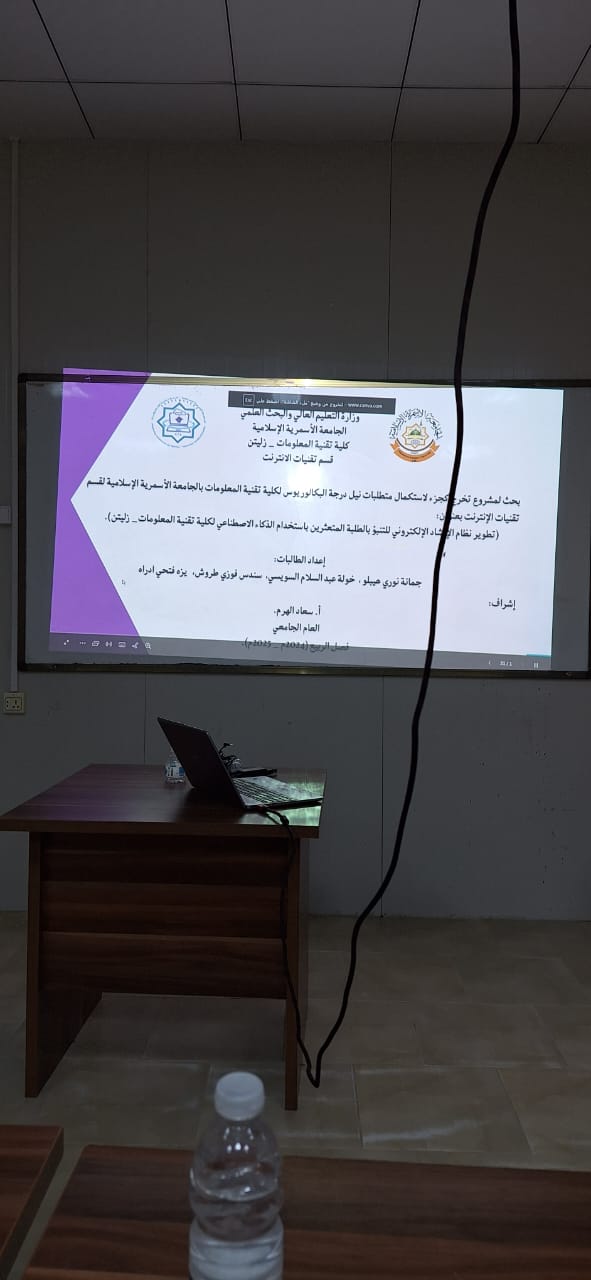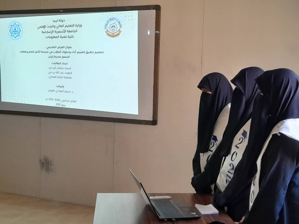 بفضل الله وتوفيقه تم اليوم2025/7/20 اختتام مناقشة مشاريع التخرج لطلاب الكلية التي استمرت لثلاثة أيام، وبهذه المناسبة يتقدم عميد ووكيلة الكلية بالشكر والتقدير لكل أعضاء هيئة التدريس المشرفين والمقيمين على جهودهم المثمرة، وكذلك الموظفين على دعمهم ومساندتهم..، كما يتقدم العميد و وكيلة الشؤون العلمية وأعضاء هيئة التدريس والعاملين بـكلية تقنية المعلومات بأصدق عبارات التهنئة والتبريك إلى أبنائنا وبناتنا الطلبة الذين أنهوا مناقشة مشاريع تخرجهم بنجاح، ضمن متطلبات نيل درجة البكالوريوس في ربيع 2025.