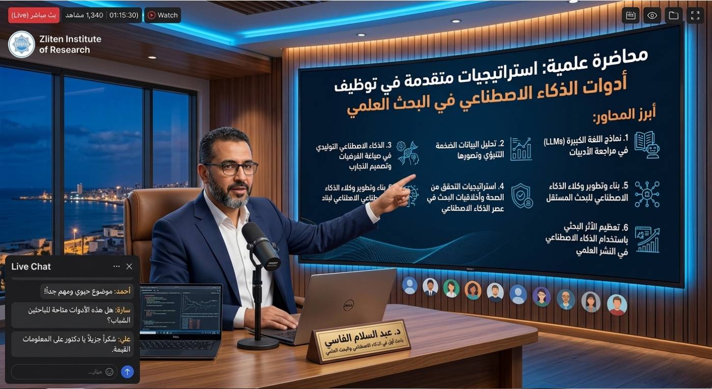 أقام قسم البحوث والاستشارات بكلية تقنية المعلومات بالجامعة الأسمرية مساء يوم الأربعاء 10 ديسمبر 2025 محاضرة علمية عبر منصة Zoom بعنوان: استراتيجيات متقدمة في توظيف أدوات الذكاء الاصطناعي في البحث العلمي، قدمها الدكتور نشأت الرفاعي، المتخصص في الذكاء الاصطناعي وعلم البيانات.