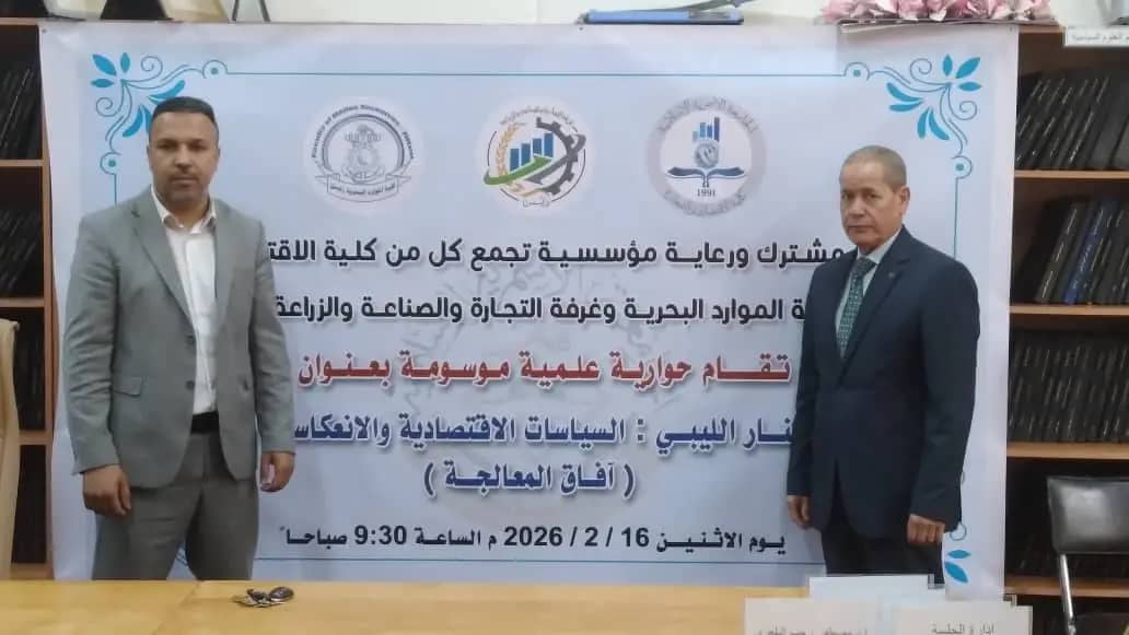 📌فمن خلال حدث علمي مشترك نظمت كل من كلية الموارد البحرية بالجامعة الأسمرية الإسلامية، وكلية الاقتصاد والتجارة وغرفة التجارة والصناعة والزراعة زليتن، يوم الاثنين الموافق 16 فبراير 2026م، جلسة حوارية علمية بعنوان: