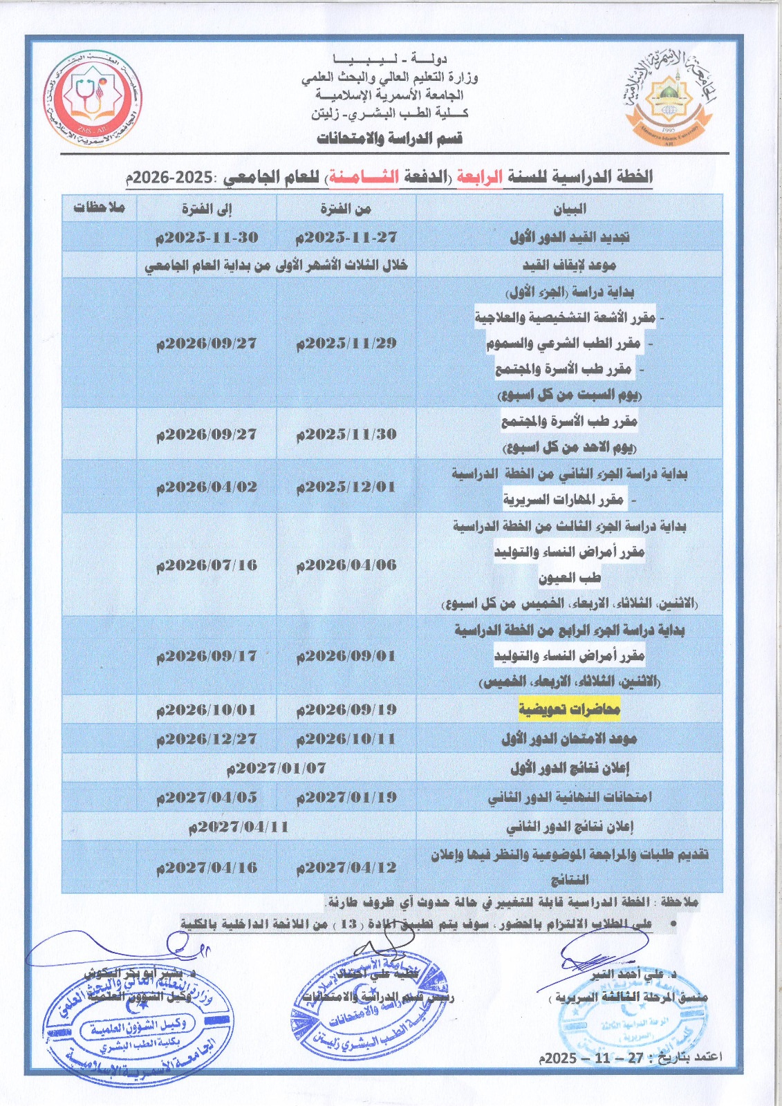 الخطة الدراسية للسنة الرابعة الدفعة الثامنة 2025-2026م