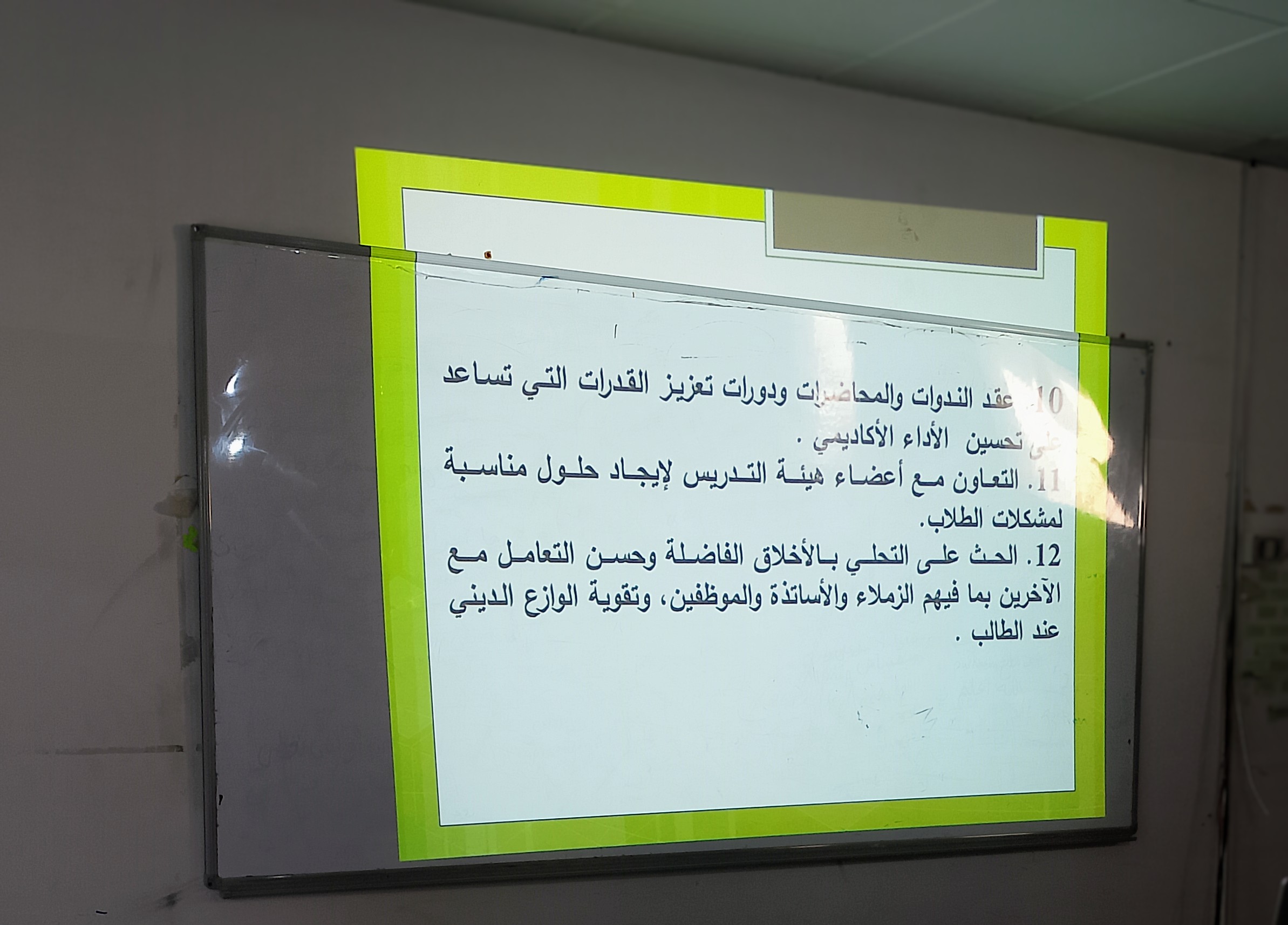شهدت الورشة حضور #السادة رؤساء الأقسام العلمية وعدد من أعضاء هيئة التدريس، حيث تناولت محاور تتعلق بتطوير آليات الإرشاد، ودور المرشد الأكاديمي في متابعة الطلبة، وأساليب تحسين التواصل الأكاديمي داخل الكلية.