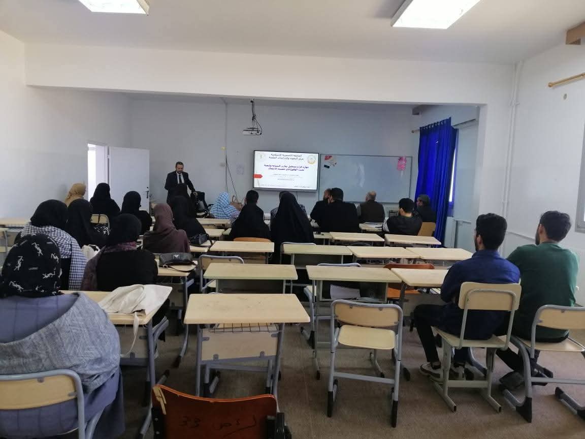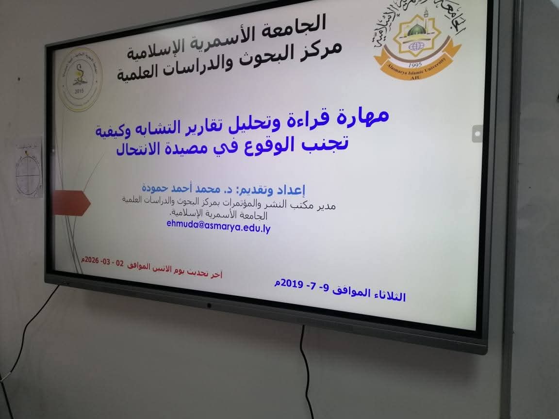 وقد قدّم المحاضرة #الدكتور محمد أحمد احمودة مدير مكتب النشر والمؤتمرات بمركز البحوث والدراسات العلمية بـ الجامعة الأسمرية الإسلامية، حيث استعرض بأسلوب علمي منهجي آليات التعامل مع تقارير التشابه، وبيّن الفرق بين التشابه المقبول علميًا والانتحال غير المشروع، موضحًا أبرز الأخطاء الشائعة التي يقع فيها الباحثون، مع تقديم إرشادات عملية لضمان سلامة الأعمال البحثية وفق المعايير الأكاديمية المعتمدة.