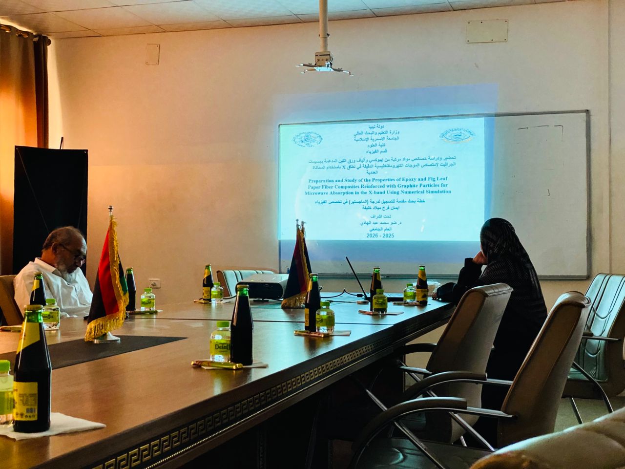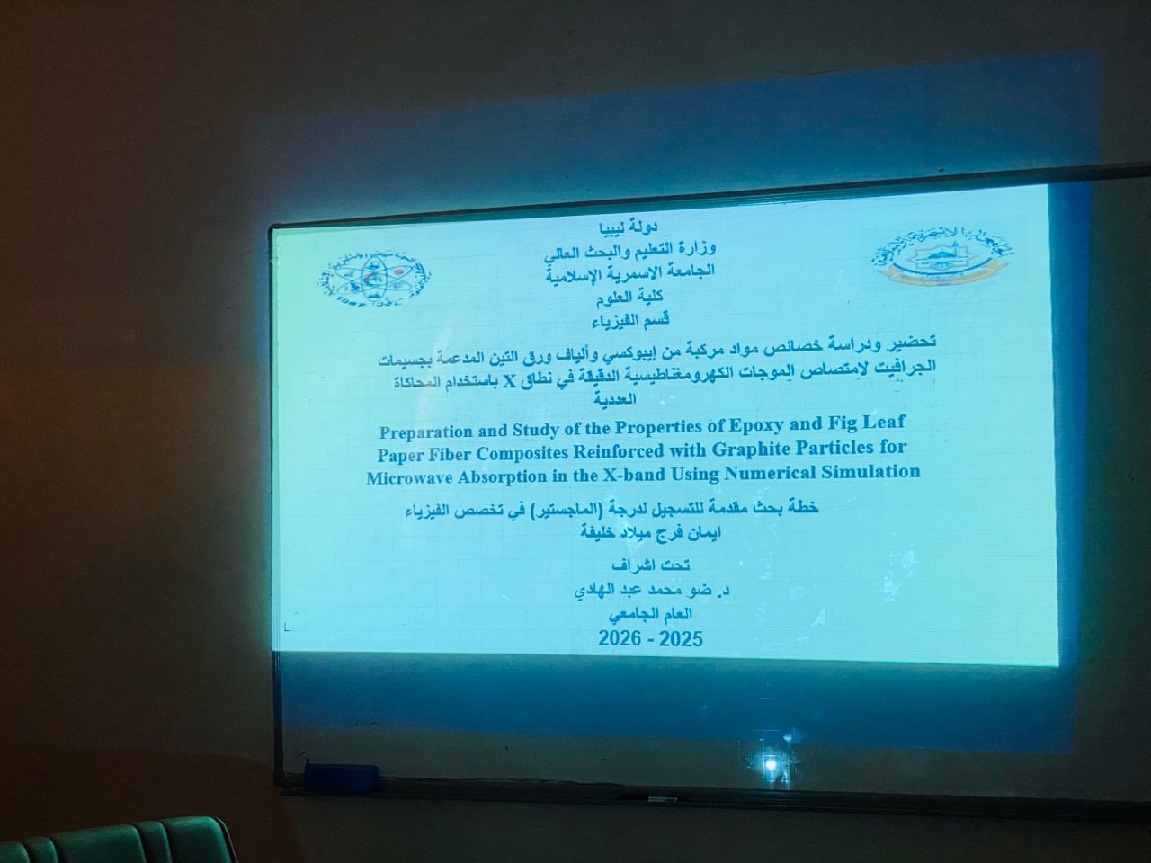 نوقش اليوم الاثنين الموافق 17/11/2025، عند الساعة الثانية عشرة ظهرًا بقاعة اجتماعات الكلية، مقترح تسجيل رسالة الماجستير للطالبة إيمان فرج ميلاد خليفة في قسم الفيزياء، بعنوان: